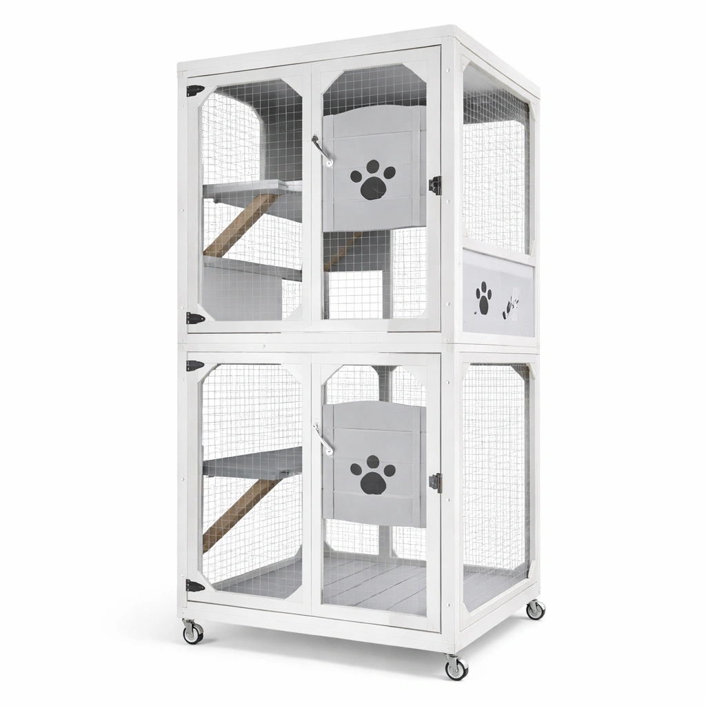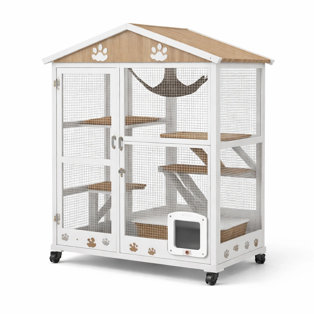 Jaula para gatos de madera con ruedas blanca